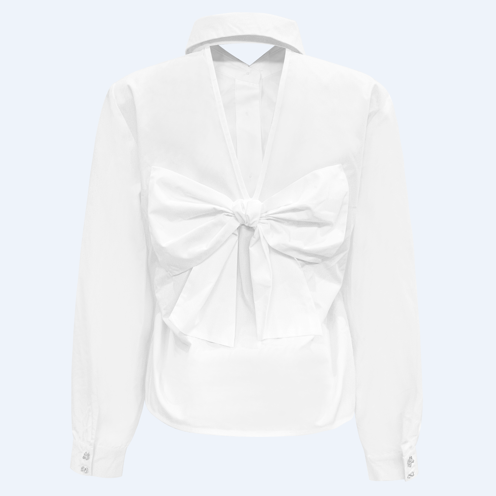 Alt i alt er denne skjorte et must-have for enhver kvinde, der elsker unikke detaljer og elegant design. De fine sløjfer og den trekantede åbning i ryggen gør denne skjorte til et ægte statement-piece, som er både stilfuld og behagelig at bære.
