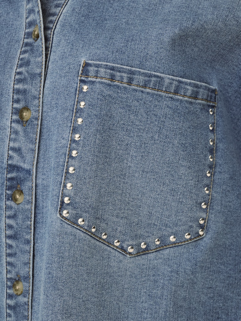 Brystlommen er dekoreret med fine simili-sten, der tilføjer et strejf af elegance og gør skjorten unik. Det subtile glimt fra stenene skaber en flot kontrast til den rå denim og tilfører et eksklusivt touch. De 3/4-lange ærmer giver skjorten et let og luftigt look og gør den perfekt til overgangssæsonerne, hvor du har brug for en alsidig overdel.