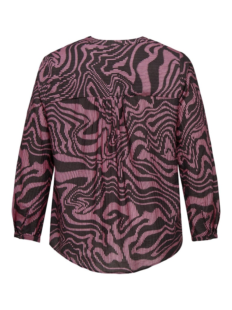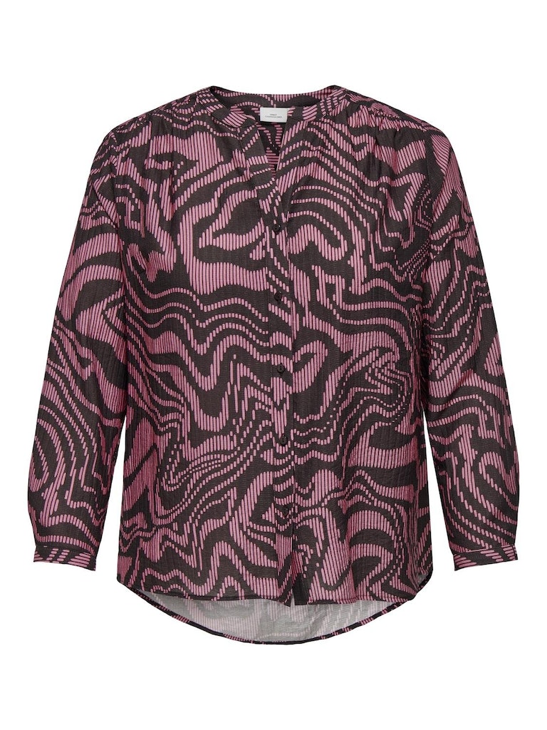 Skjorten har lange ærmer og en skjult knaplukning, hvilket giver et elegant og rent look. Den diskrete knaplukning fremhæver det grafiske mønster og gør skjorten nem at style med forskellige typer underdele. Skjorten går lidt længere ned bagpå, hvilket skaber et moderne snit og giver en flatterende silhuet.