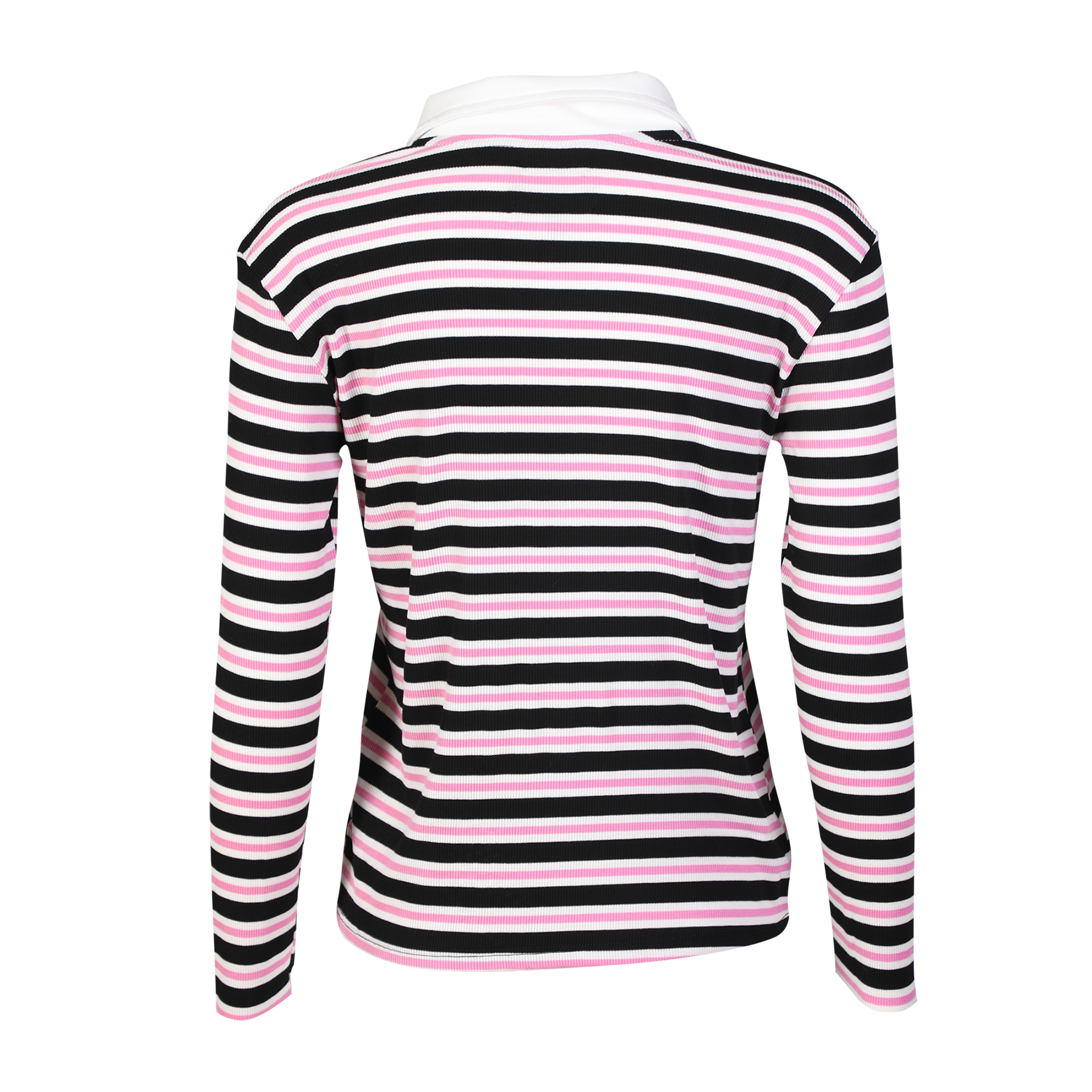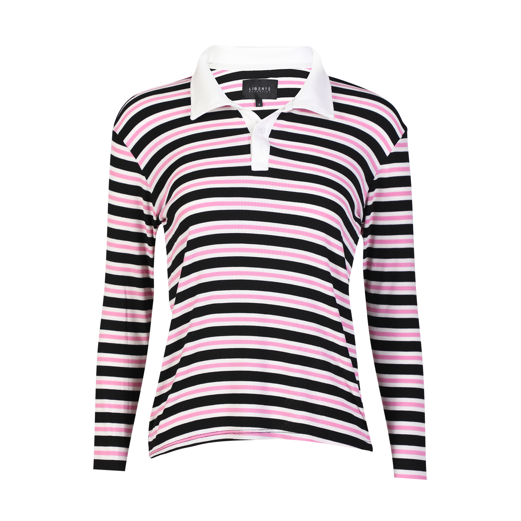 Denne NATALIA LS POLO BLOUSE er en perfekt kombination af klassisk elegance og moderne stil. Med sit tidløse polo-design og det trendy stribede mønster i sort, bubblegum pink og hvid skaber den et iøjnefaldende og sofistikeret look.