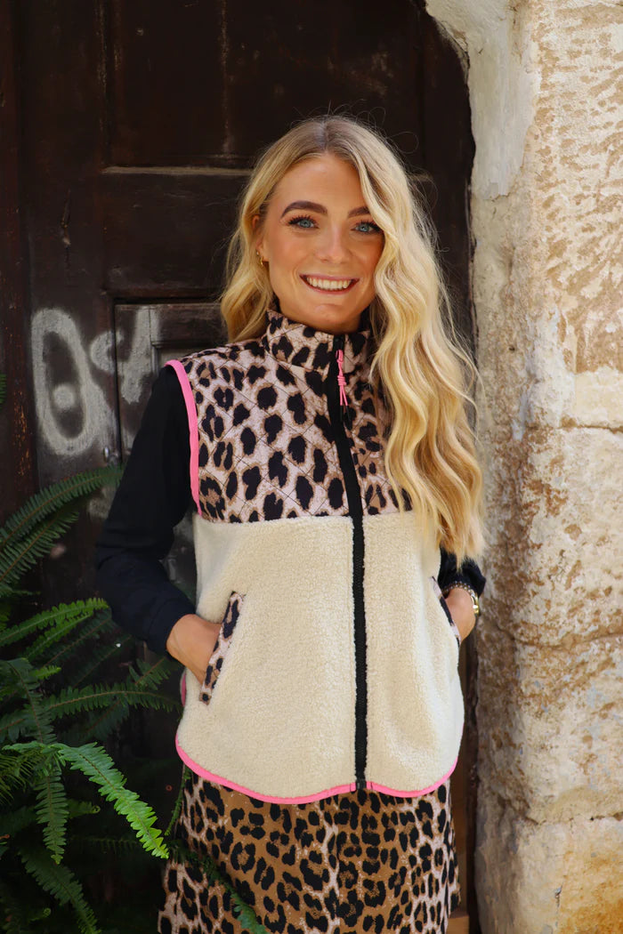 Vesten er designet med en smuk quiltet detalje øverst, der tilføjer et eksklusivt touch og en sofistikeret struktur. Den nederste del af vesten er fremstillet af blødt teddy-materiale, som føles behageligt mod huden og giver en hyggelig varme på kølige dage. Det hele bindes elegant sammen af en delikat lyserød kant, som skaber en feminin og trendy kontrast. Den samme farve går igen på lynlåsen, hvilket giver et stilrent og gennemtænkt look.