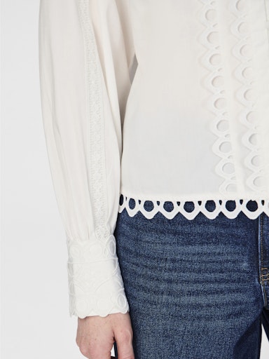Skjorten har en klassisk kinakrave, der tilføjer et strejf af enkelhed til det ellers rige design. Den tidløse halsudskæring passer perfekt til broderiets delikate mønstre og sikrer et elegant og afbalanceret udtryk. De flotte manchetter er ikke bare praktiske, men fungerer også som en smuk afslutning på de lange ærmer, hvilket fremhæver skjortens feminine og sofistikerede design.