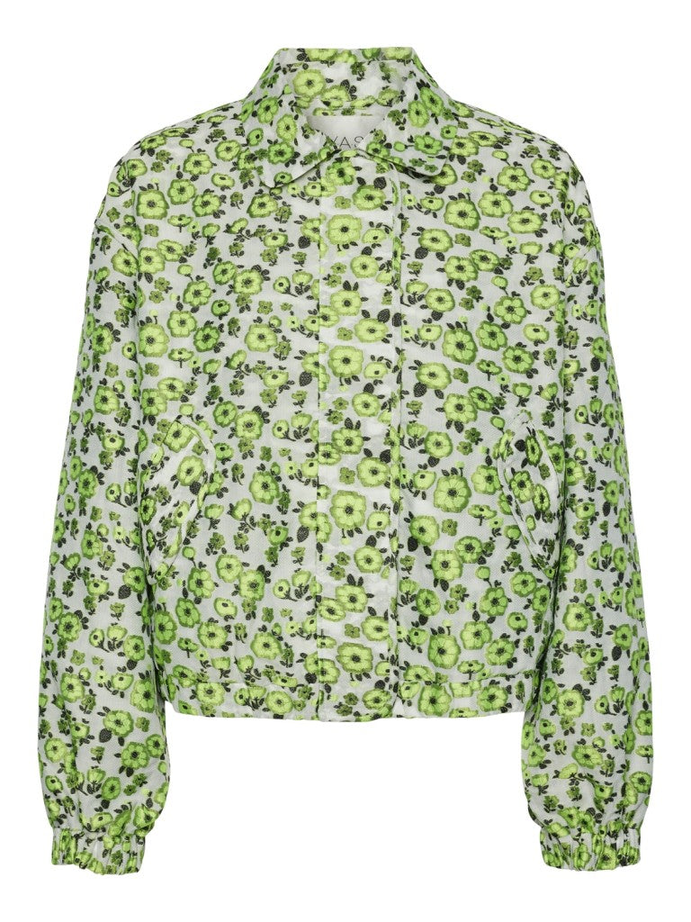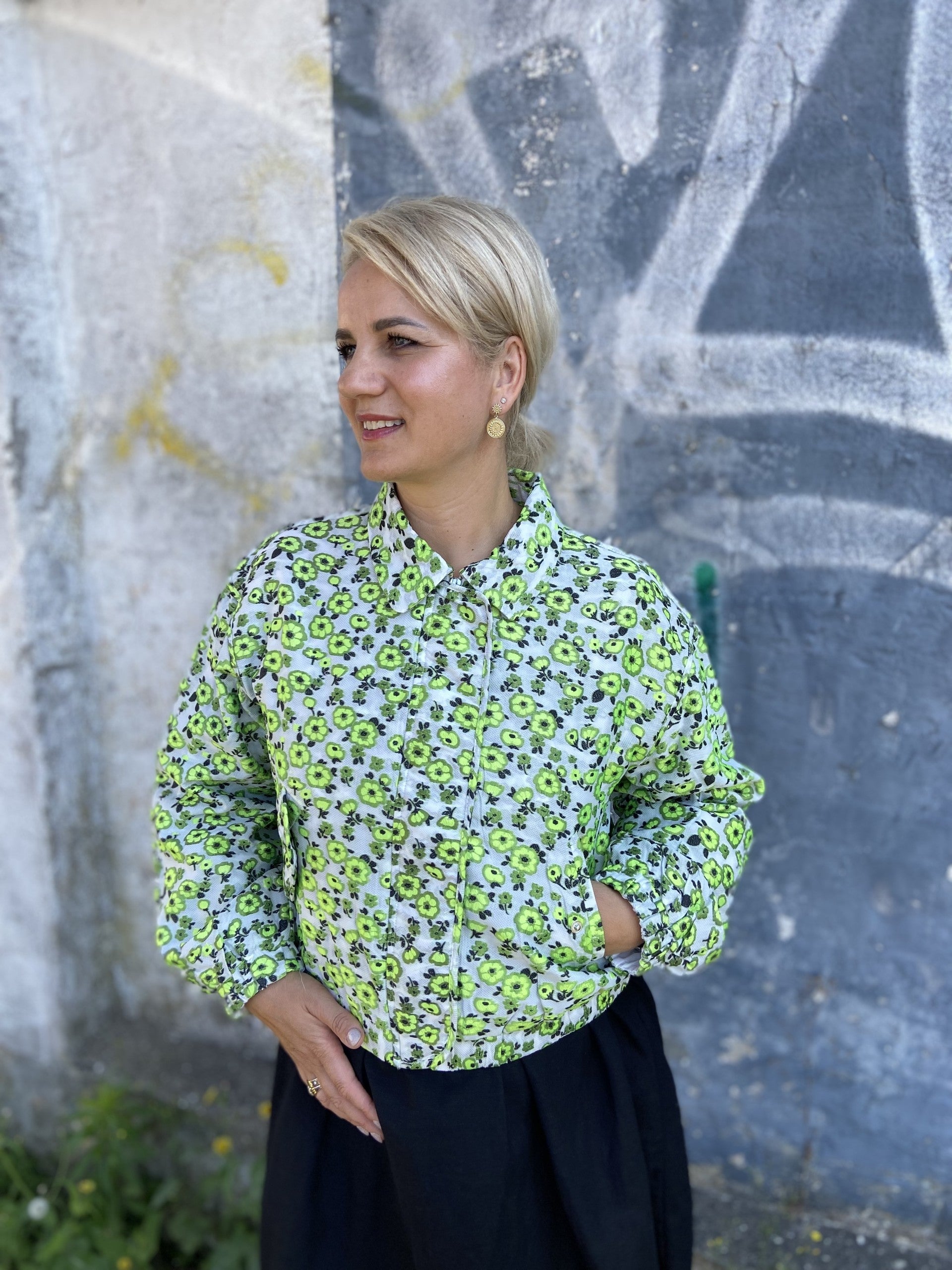 Kort let forede bomberjakke med små grønne blomster. Jakken lukkes med lynlås og knapper.